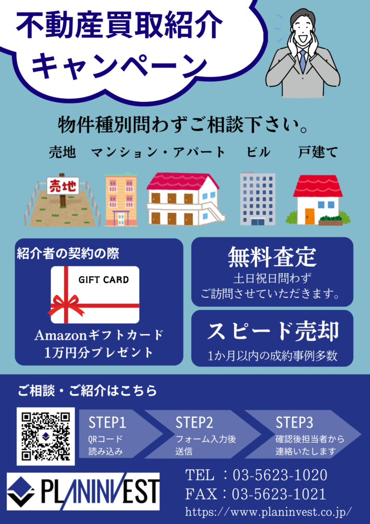お客様からご紹介いただいた方が、PLANINVESTでの媒介契約書が締結した場合に特典をご用意いたします。